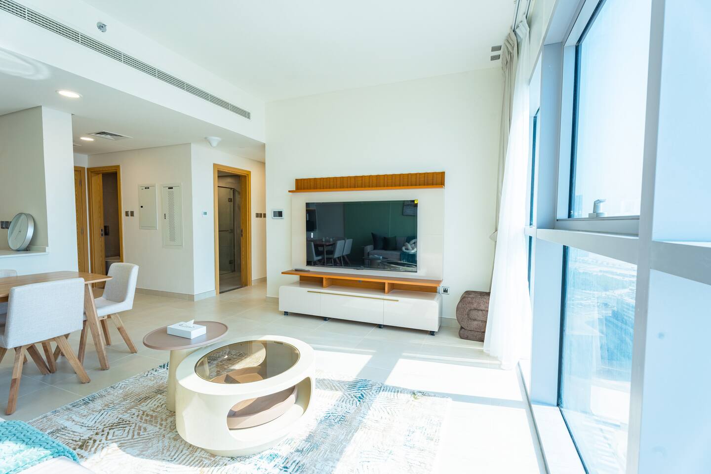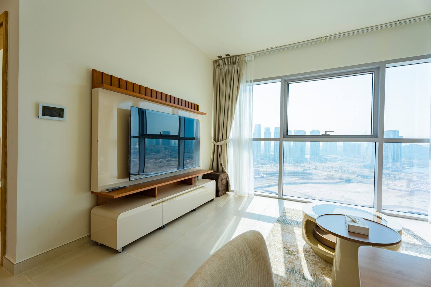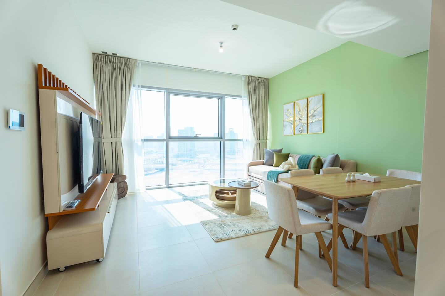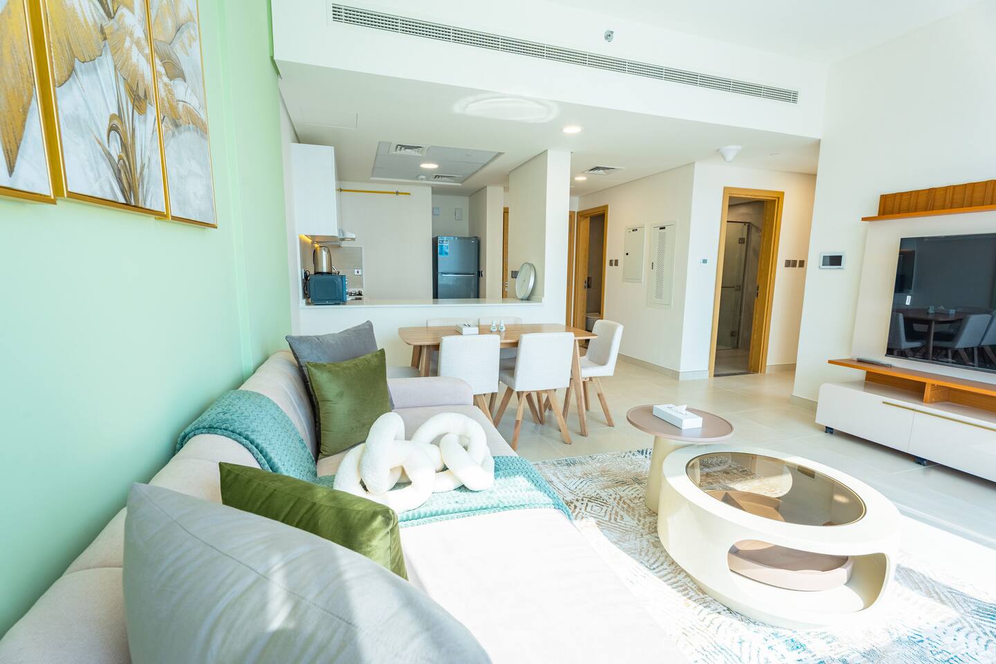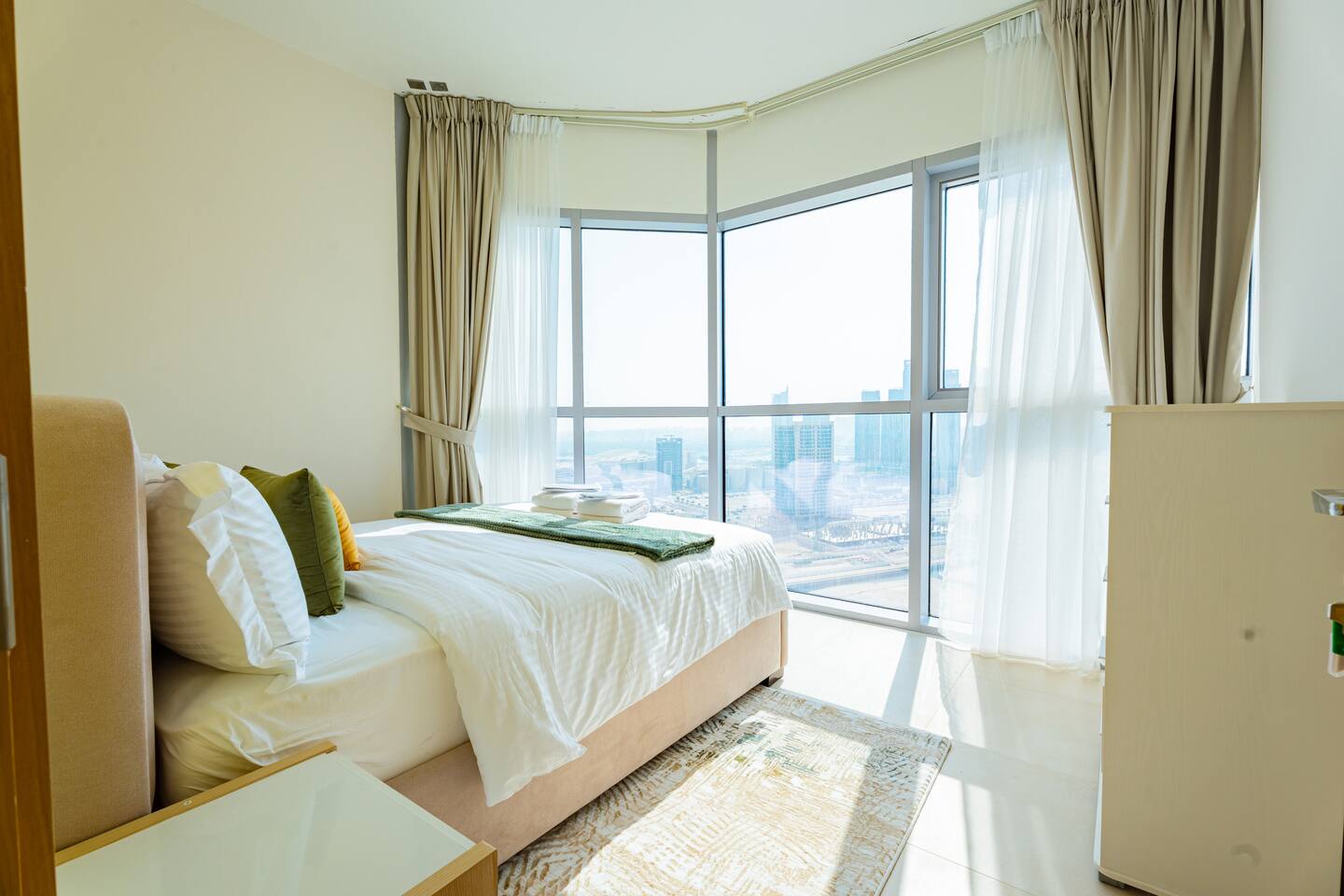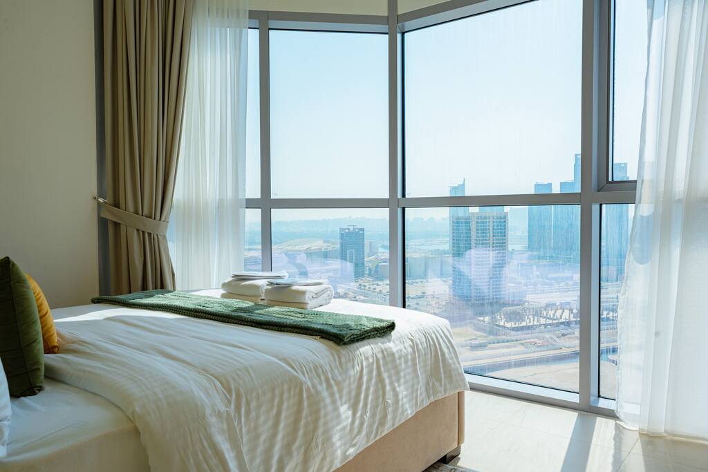🛏️ What You’ll Get: Two cozy queen-size beds A comfy sofa bed in the living area Sleeps 7–8 guests comfortably Soft linens, fresh towels, and extra bedding provided 📺 Entertainment & Comfort: Huge 65-inch Smart TV for movie nights or catching up on your favorite shows High-speed Wi-Fi Fully equipped kitchen with modern appliances Central AC and in-unit washing machine 🌇 Panoramic Views & Prime Location: Enjoy stunning views of Reem Island from the apartment’s large windows Set in a secure, peaceful building with convenient access to nearby cafes, supermarkets, and major city attractions 🧼 Fresh & New: Spotlessly clean, thoughtfully designed, and brand-new—be one of the first to stay! This apartment is perfect for both short and extended stays. Whether you're here to explore Abu Dhabi, visit Yas Island, or just unwind, you’ll feel right at home.