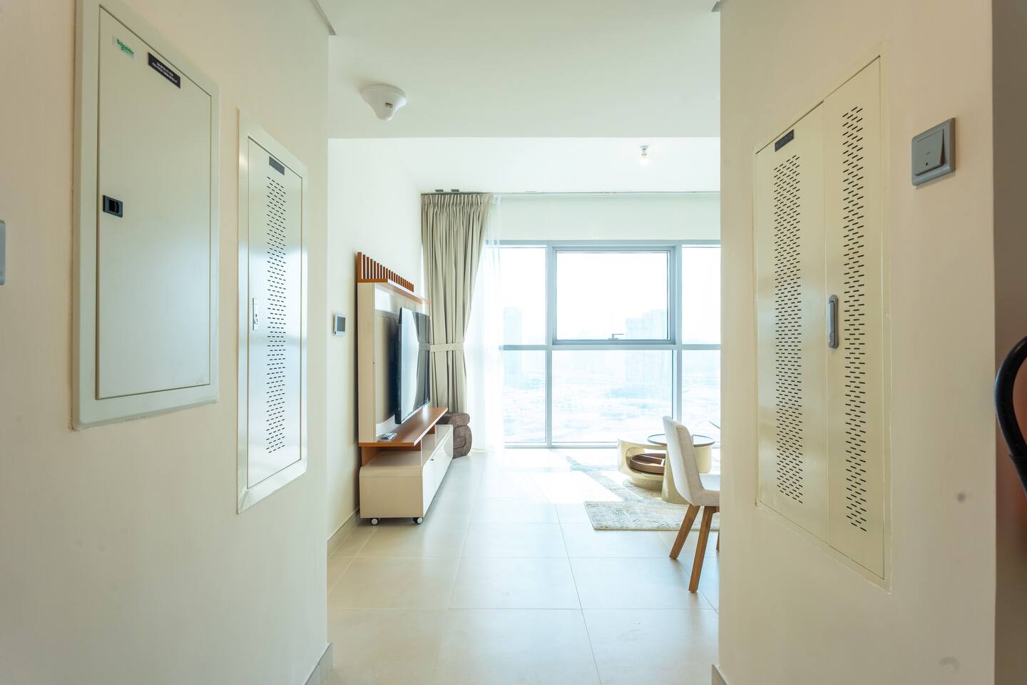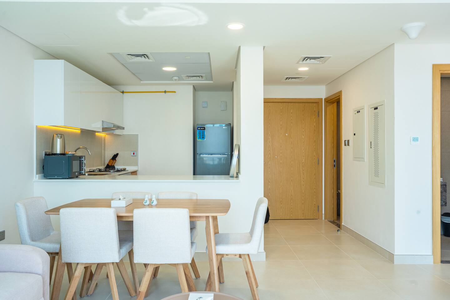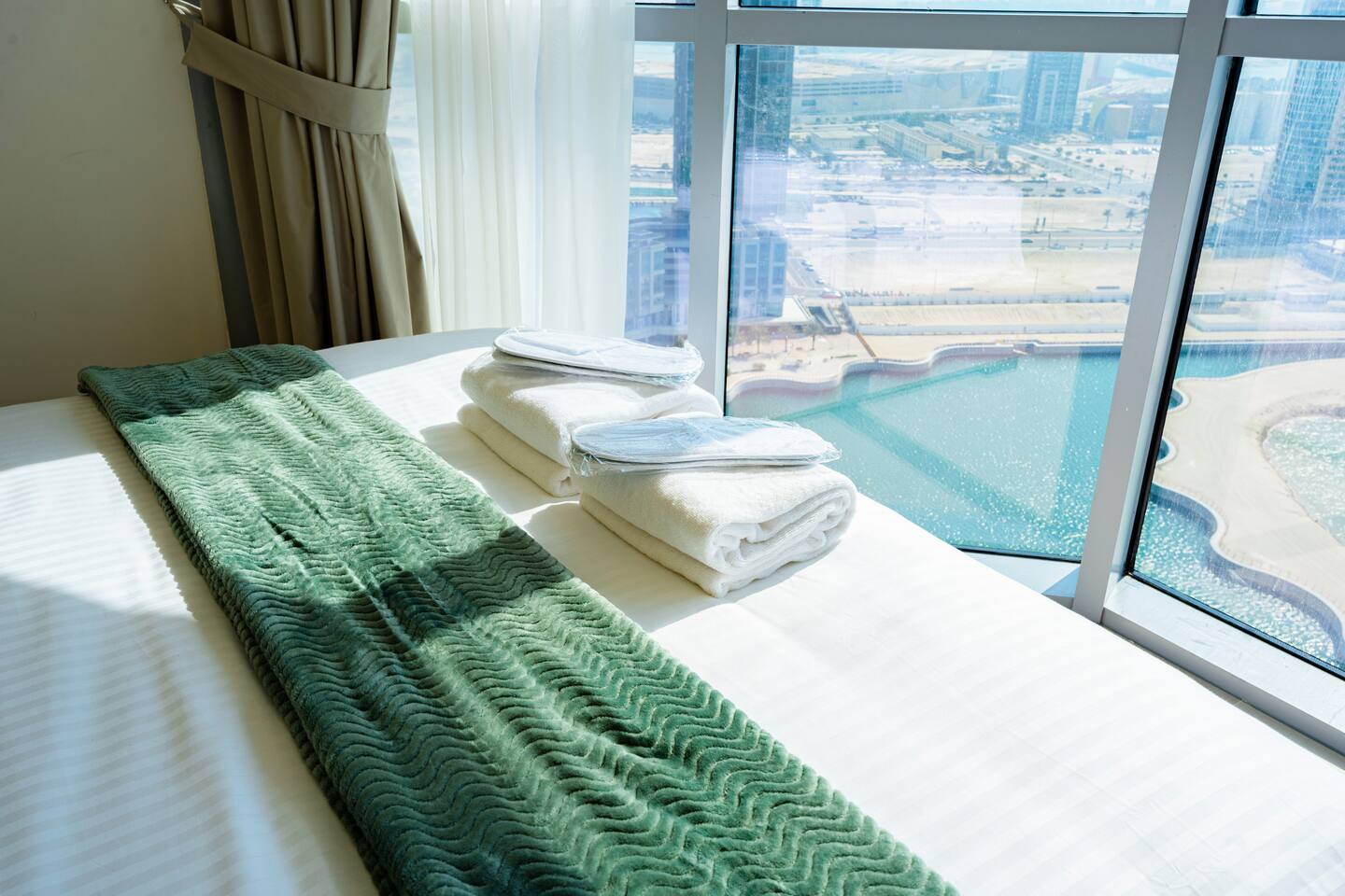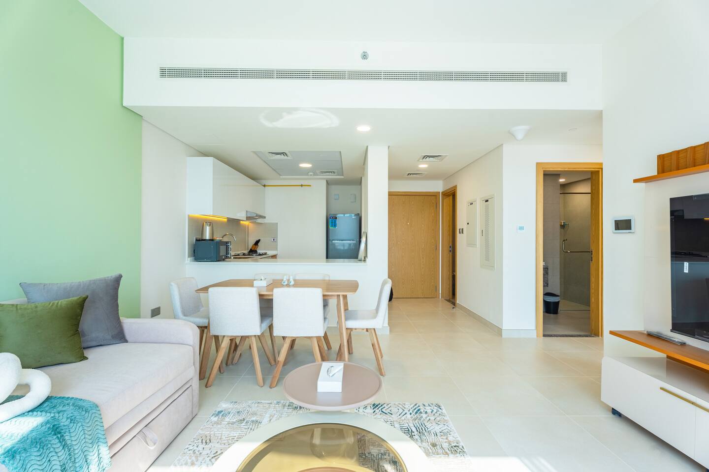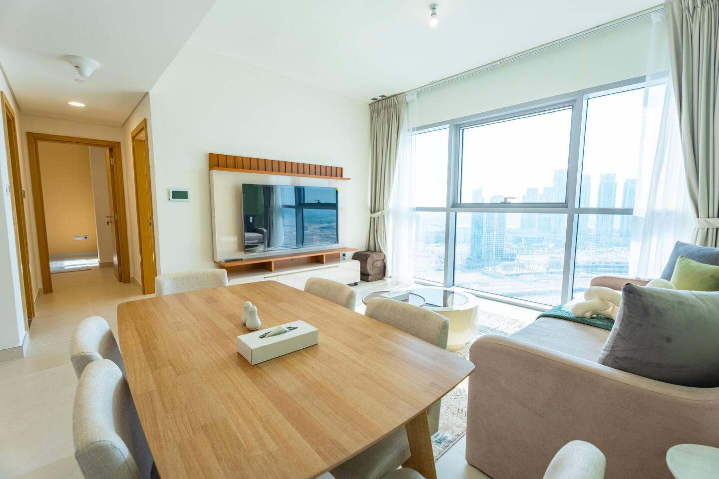 🛏️ What You’ll Get: Two cozy queen-size beds A comfy sofa bed in the living area Sleeps 7–8 guests comfortably Soft linens, fresh towels, and extra bedding provided 📺 Entertainment & Comfort: Huge 65-inch Smart TV for movie nights or catching up on your favorite shows High-speed Wi-Fi Fully equipped kitchen with modern appliances Central AC and in-unit washing machine 🌇 Panoramic Views & Prime Location: Enjoy stunning views of Reem Island from the apartment’s large windows Set in a secure, peaceful building with convenient access to nearby cafes, supermarkets, and major city attractions 🧼 Fresh & New: Spotlessly clean, thoughtfully designed, and brand-new—be one of the first to stay! This apartment is perfect for both short and extended stays. Whether you're here to explore Abu Dhabi, visit Yas Island, or just unwind, you’ll feel right at home.