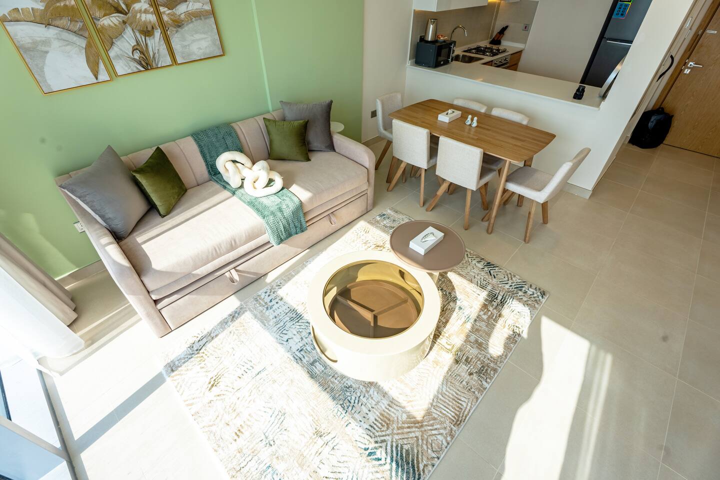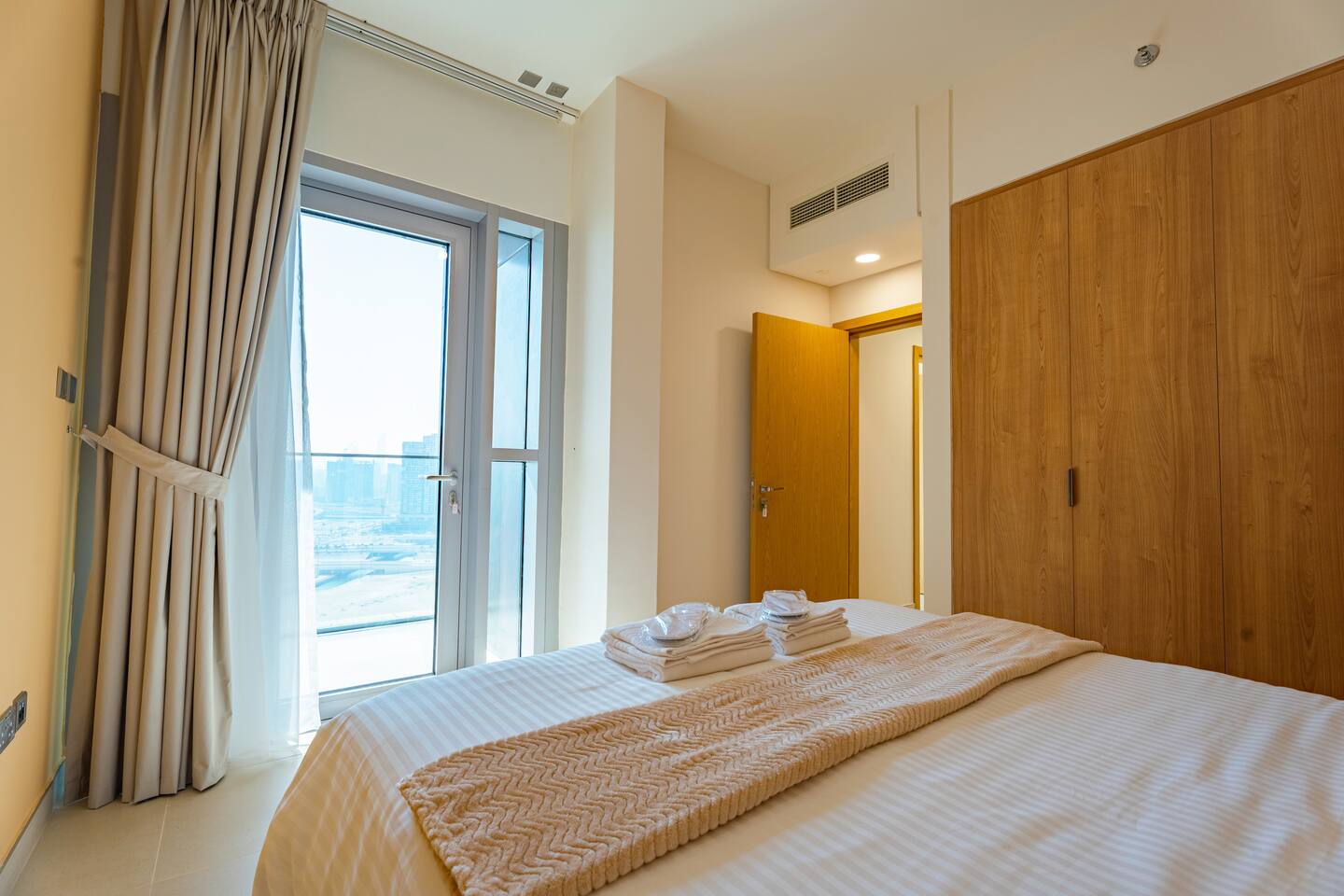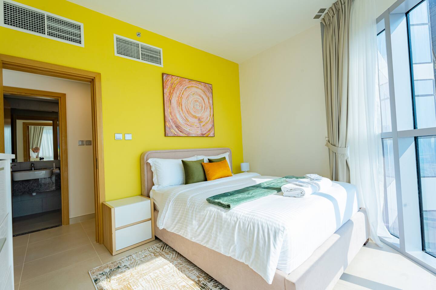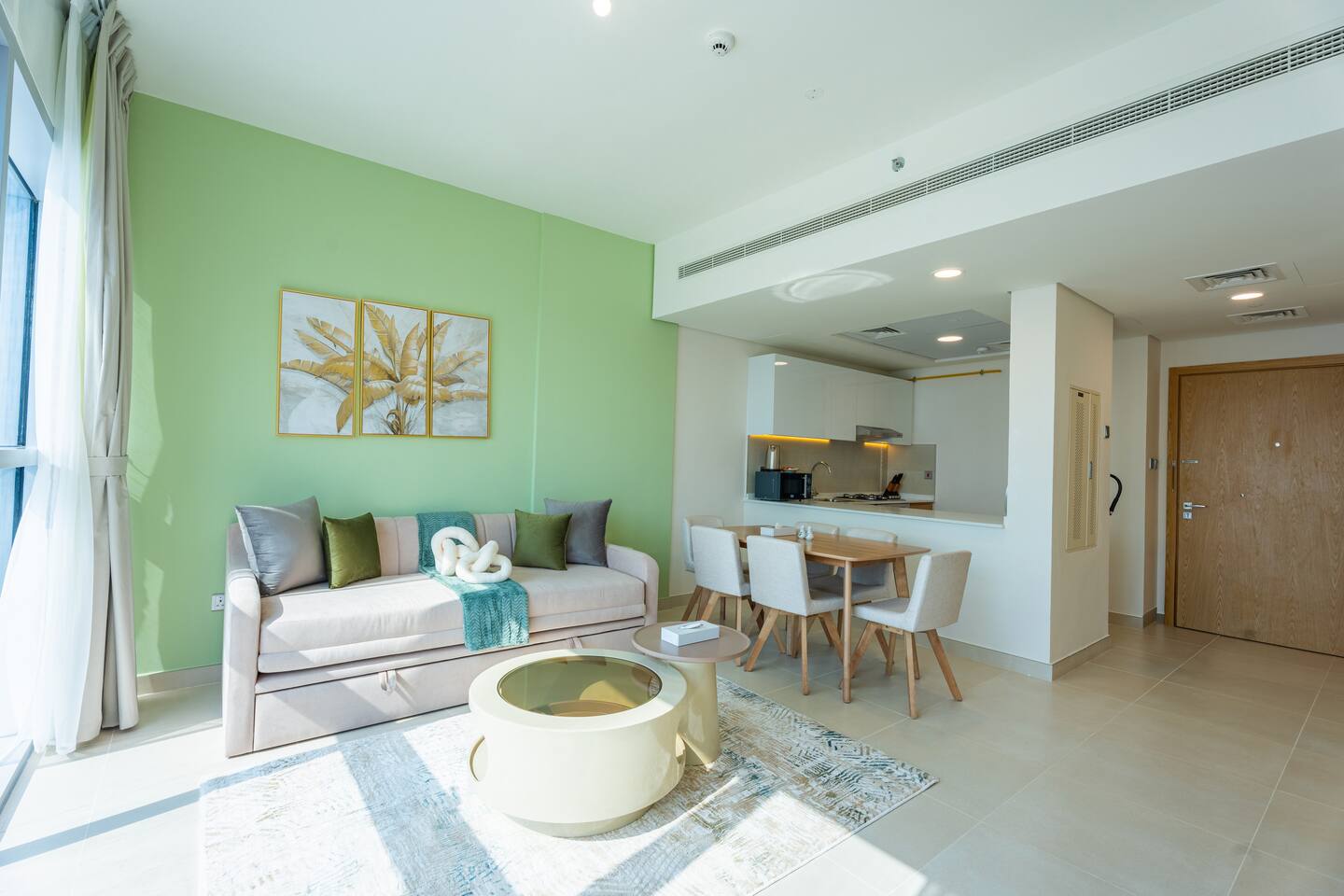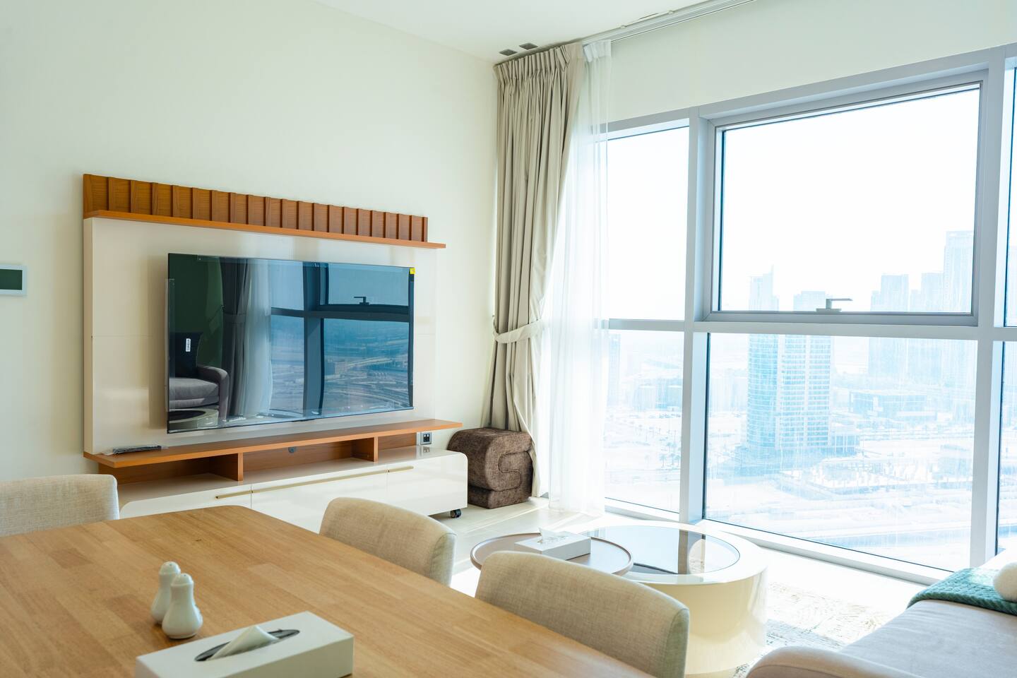 🛏️ What You’ll Get: Two cozy queen-size beds A comfy sofa bed in the living area Sleeps 7–8 guests comfortably Soft linens, fresh towels, and extra bedding provided 📺 Entertainment & Comfort: Huge 65-inch Smart TV for movie nights or catching up on your favorite shows High-speed Wi-Fi Fully equipped kitchen with modern appliances Central AC and in-unit washing machine 🌇 Panoramic Views & Prime Location: Enjoy stunning views of Reem Island from the apartment’s large windows Set in a secure, peaceful building with convenient access to nearby cafes, supermarkets, and major city attractions 🧼 Fresh & New: Spotlessly clean, thoughtfully designed, and brand-new—be one of the first to stay! This apartment is perfect for both short and extended stays. Whether you're here to explore Abu Dhabi, visit Yas Island, or just unwind, you’ll feel right at home.